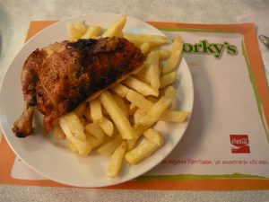 Es el fast food peruano por excelencia, como su nombre lo dice es un Pollo asado al carbón o a la leña acompañado de papas fritas y ensalada.