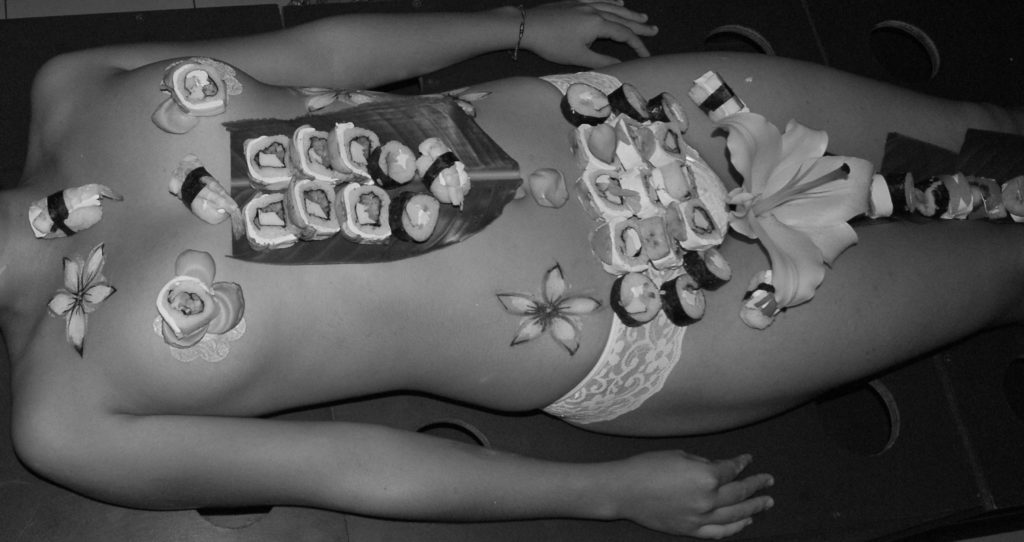 El sushi se sirve encima del cuerpo de una mujer, este lugar es el preferido para las reuniones de negocio. No te preocupes por la higiene, los platillos están encima de una hoja de plátano o un plástico que casi no se ve.
