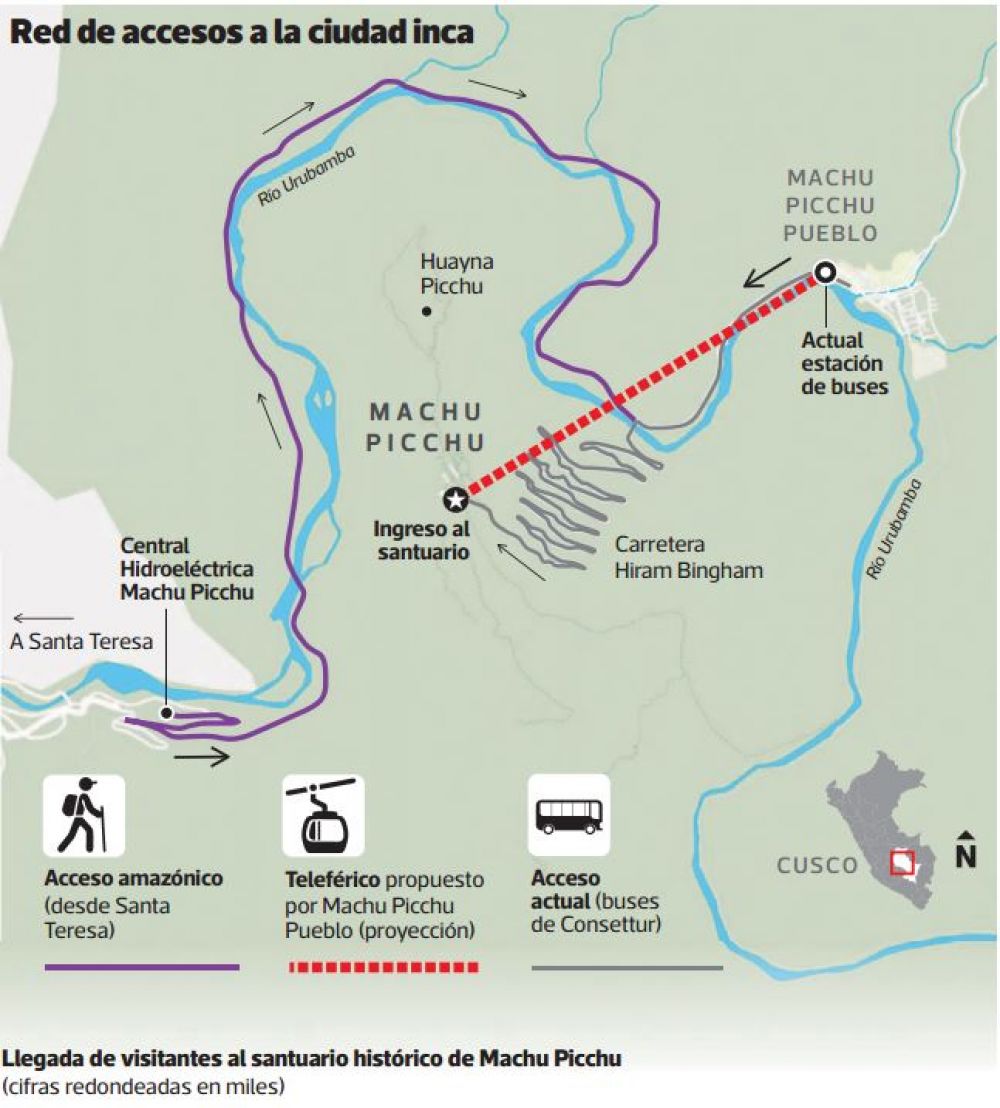 Actualmente uno puede llegar hasta el santuario de Machu Picchu desde Aguas Calientes a pie o por bus. Sin embargo debido a esta propuesta se ampliaría una nueva opción. Una red de teleféricos de 1.5 km que funcionarían desde la localidad.