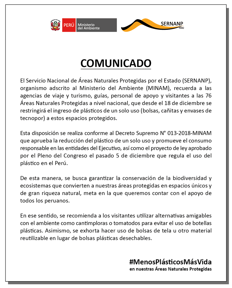 #Menosplástico y más vida es la medida que entra en vigencia desde mañana martes 18 de diciembre los turistas no podrán llevar bolsas de plástico, cañitas y envases de tecnopor a los sitios protegidos, informó el Sernanp.