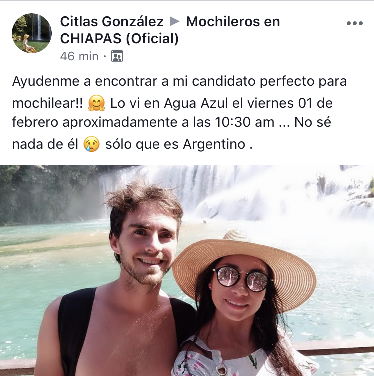 «Ayúdenme a encontrar a mi candidato perfecto para mochilear! Lo vi en Agua Azul el viernes 01 de Febrero aproximadamente a las 10:30am… No sé nada de él, solo que es Argentino» Indicó en un grupo de Mochileros en México.