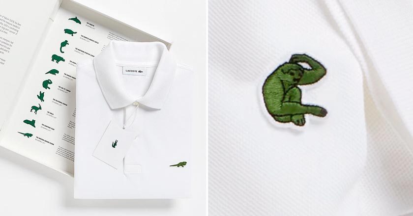 Lacoste reemplazo a su animal por especies en peligro de extinción. Fueron 10 especies elegidas para reemplazar al famoso cocodrilo: el cóndor de California, el saola, el tigre de Sumatra, la iguana de Anegada, la vaquita, la tortuga de techo Birmana, el lémur del norte, el rinoceronte de java y el gibón de Cao-vit y el kakapo.