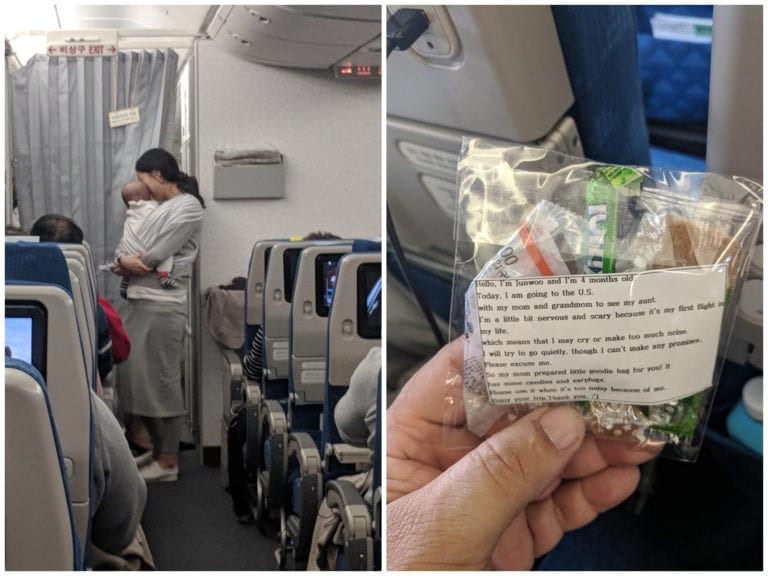 La mamá armó 200 bolsas de dulces, estuvo explicando su situación: “Hola, soy Junwoo y solo tego cuatro meses. Estoy yendo a Estados Unidos con mi mamá y mi abuela a visitar a mi tía. Es mi primer vuelo y es por ello que me encuentro muy nerviosa, es por eso que lloro o hacer mucho ruido. Tratare de ir en silencio, pero no lo prometo. Por favor discúlpenme. ¡Mi mamá hizo una bolsa de regalos para ustedes! Cuenta con caramelos y tapones para los oídos. Por favor, utilízalo cuando haya demasiado ruido por mis llantos. Espero disfruta tu viaje, gracias”.