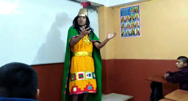 Juan Ebert Quispe Aguilar decidió utilizar métodos innovadores para poder llamar la atención de sus alumnos en Cusco. Por lo que decidió vestirse de los personajes de historia que narraba. Como por ejemplo del Inca Pachacutec, el Faraón Ramsés II y Cristobal Colón.