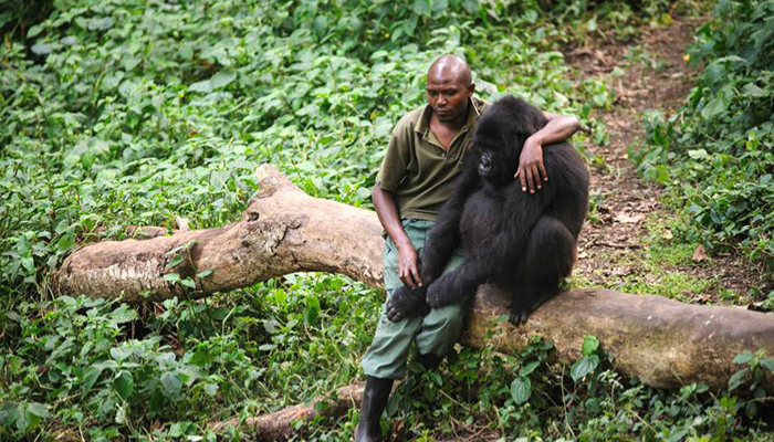 En la foto de arriba, Patrick Karabaranga, un guardaparques en el Parque Nacional Virunga en el este de la República Democrática del Congo, se sienta con un gorila huérfano en el santuario de gorilas del parque. El vínculo entre ellos es realmente conmovedor y el gorila muestra su aprecio por la simpatía colocando su mano en la pierna del guardabosques.