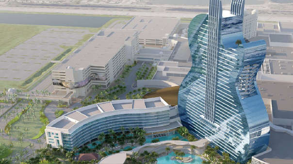El primer hotel del mundo con forma de guitarra tendrá como sede la ciudad de Hollywood en la costa del estado de Florida en Estados Unidos. El Hard Rock inaugurará su enorme edificio de 35 pisos y 1,250 habitaciones el próximo 24 de octubre.