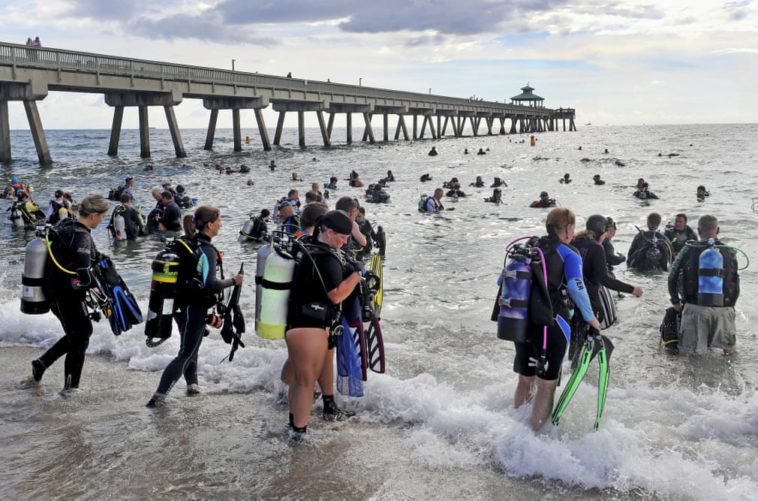 El muelle de pesca internacional de Deerfield Beach en Florida atrajo a 633 buzos este año. Este es el decimoquinto año en que se lleva a cabo la limpieza, organizada por la tienda de buceo Dixie Divers.