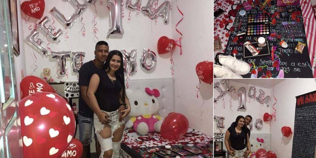 En el cuarto de la novia, el joven decoró con globos y mensajes colocados en las paredes. Sabiendo el gusto de su enamorada él le regalo maquillaje, dulces y unos tenis. Como si fuera una película, delicadamente él puso en el piso pétalos de rosa.