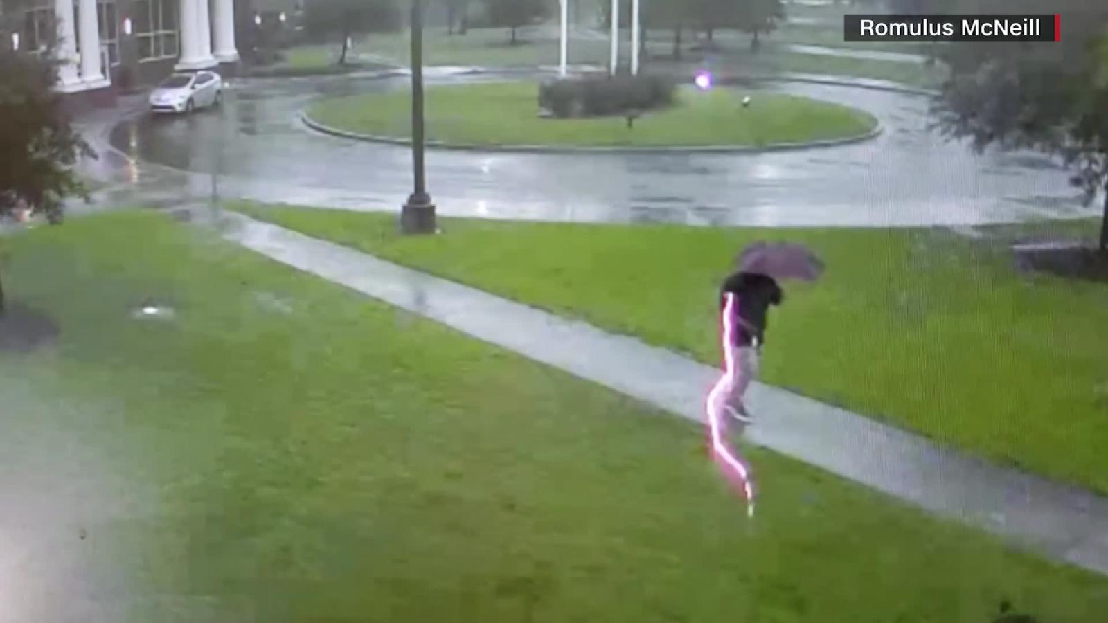 El video captó el momento donde un rayo casi alcanza el paraguas de Romulus McNeill, mientras que caminaba por la vereda en medio de una tormenta. Este video da una lección para no salir lastimados.
