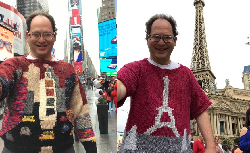 Ya casi más de 20 años, que Sam Barsky, de 43 años de edad, teje suéteres de los lugares que va a visitar y después se saca fotos de sí mismo usándolos en los destinos reales de fondo.