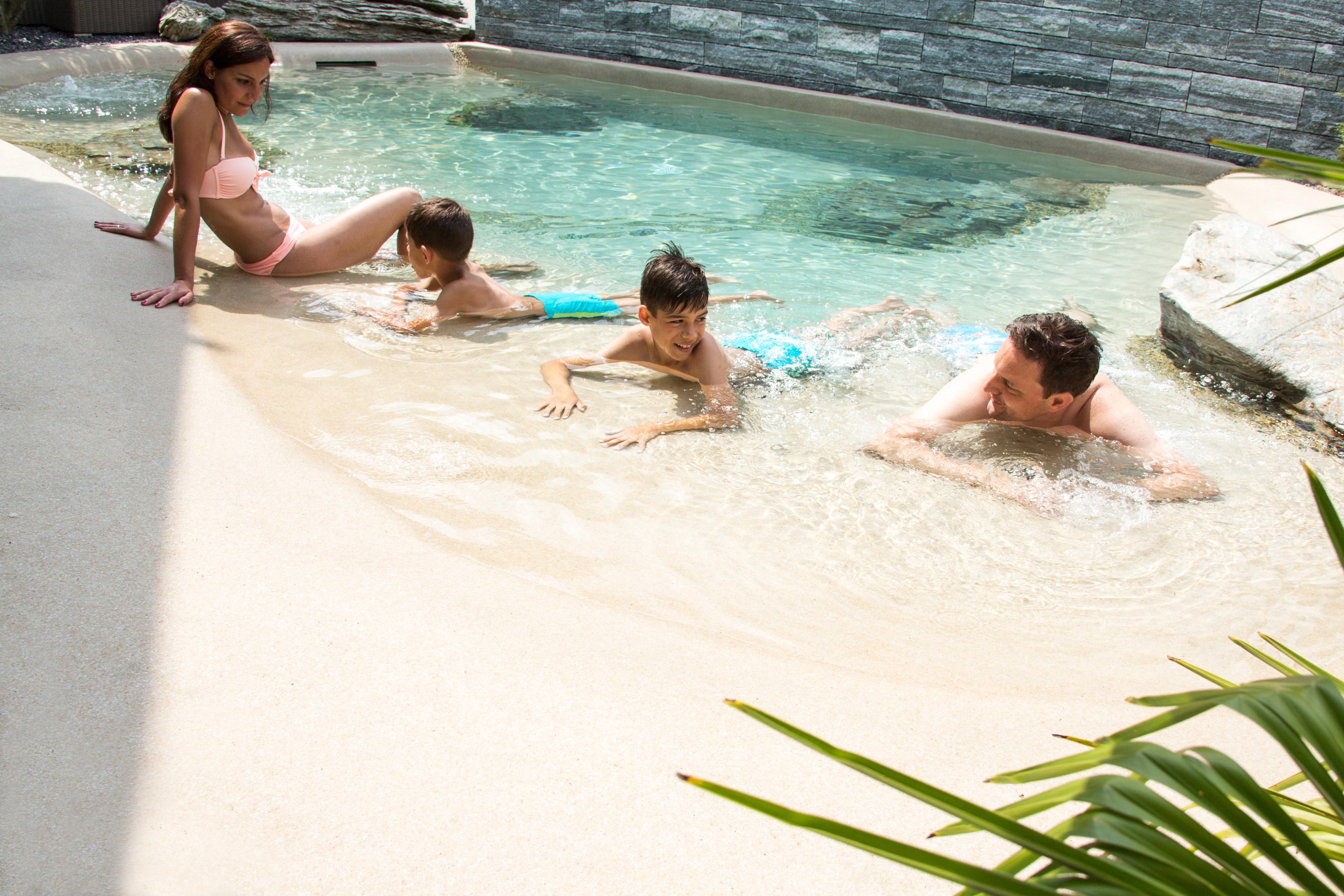 Otra gran ventaja de estas piscinas es que su terminación de arena es muy suave al tacto, pero no permite los resbalones. Su textura antideslizante y su capacidad para no alcanzar altas temperaturas la convierten en una piscina muy segura, ideal para todos.