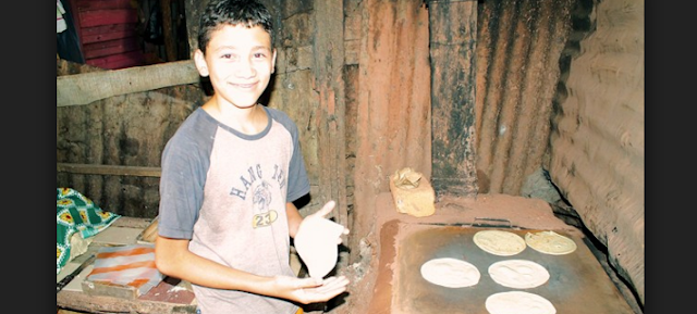 Lo encontramos atizando el fuego en su rústica cocina construida de pedazos de madera y láminas de zinc, vistiendo camiseta blanca de mangas color gris, calzoneta amarilla y chancletas azules. Son las 2:45 de la tarde y el adolescente de tez blanca se alista para emprender la faena, el fogón cimentado en piedra y lodo comienza a calentar el comal de hierro donde se coserán las tortillas, a un costado de la burda estufa, el banco de trabajo sostiene una pelota de masa que espera ser procesada.