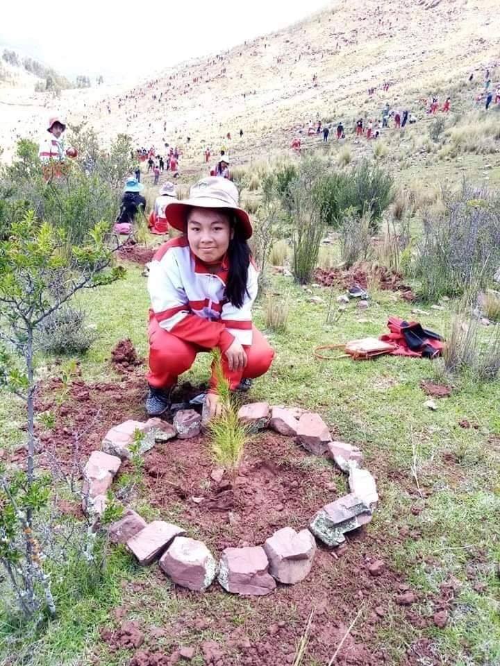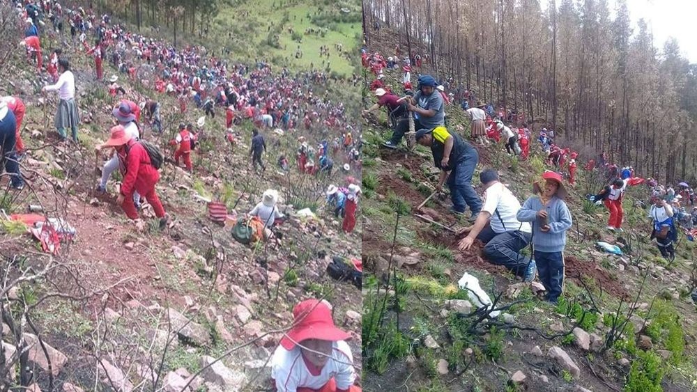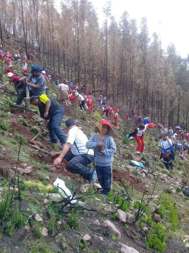 Estudiantes del Colegio Emblemático Mateo Pumacahua de Sicuani, Cusco, así como  profesores y padres de familia, sembraron 10 000 plantones de pino en áreas donde hubo incendios forestales.