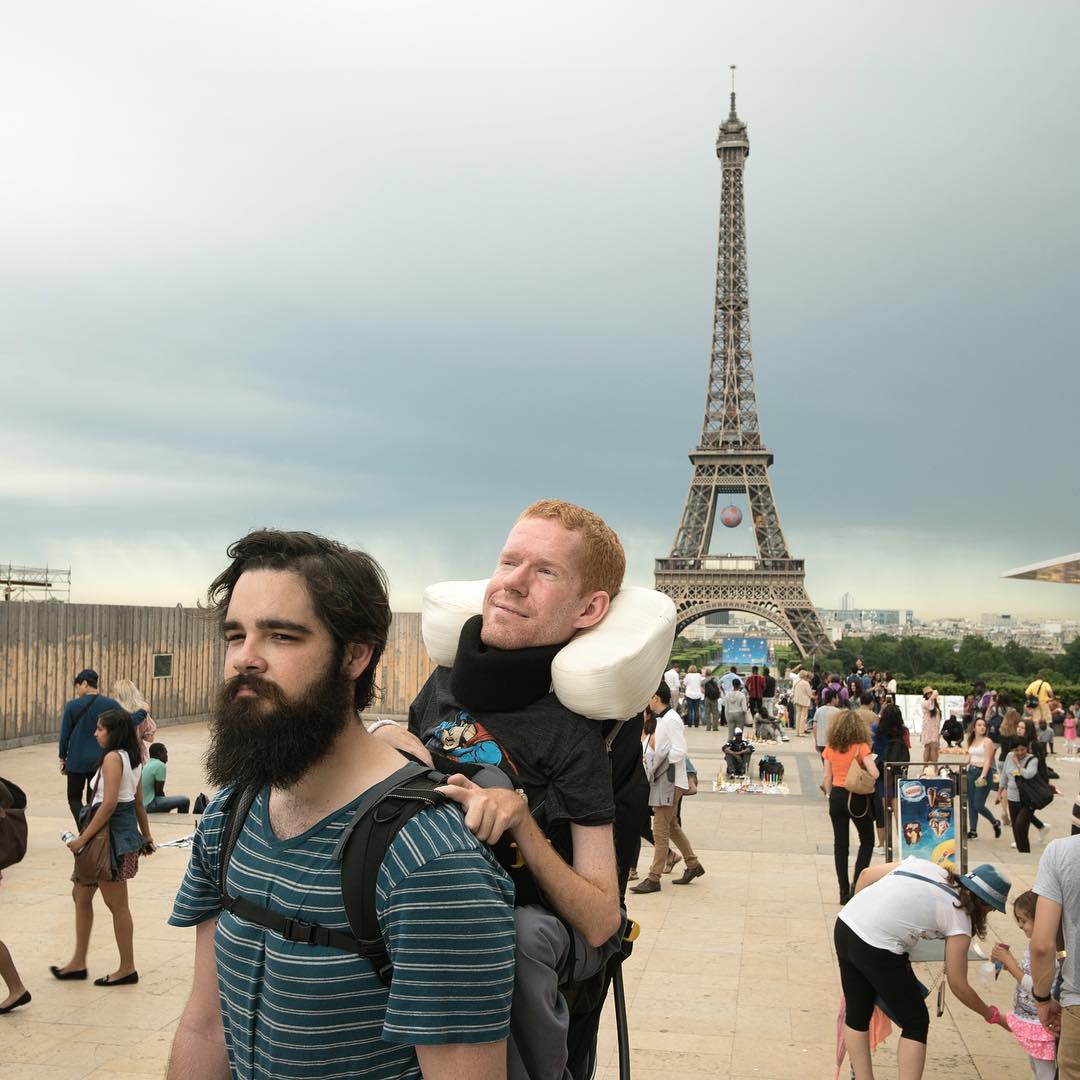 Sin embargo, sus amigos decidieron que intervendrían y lo ayudarían a experimentar la aventura con ellos al llevarlo en una mochila especialmente diseñada en Francia, Irlanda e Inglaterra.