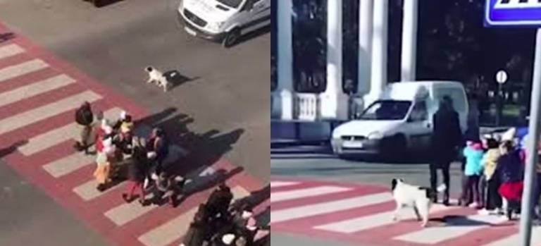 El perrito fue apodado Kupata y es originario de Georgia. El perrito salta delante de los autos y les ladra para que frenen mientras los niños comienzan a cruzar la calle en dirección al parque de la ciudad de Batumi.
