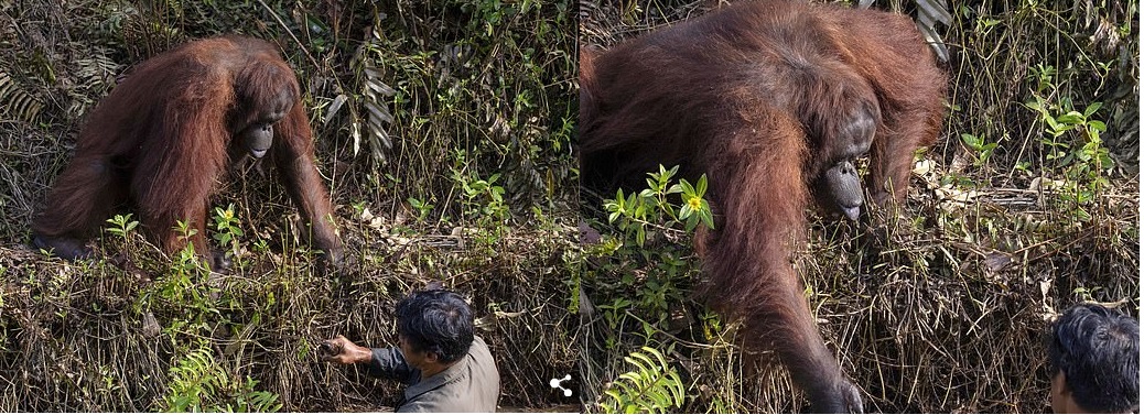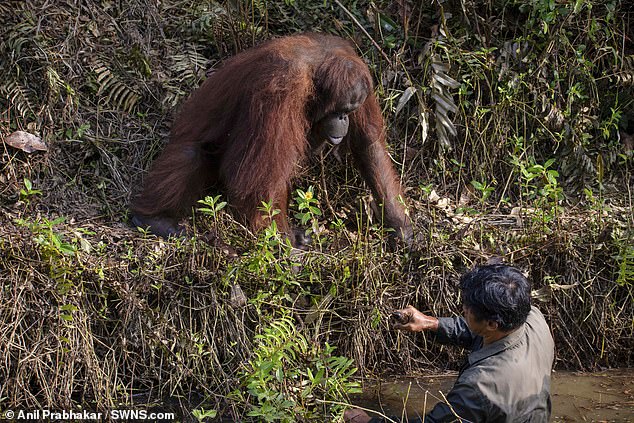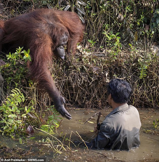 Las sorprendentes imágenes fueron tomadas por el fotógrafo aficionado Anil Prabhakar, de Indonesia, quien había estado en un safari con sus amigos cuando vio la escena conmovedora. El Sr. Prabhakar más tarde descubrió que el hombre trabajaba para la Fundación de Supervivencia de Orangutanes de Borneo, una organización sin fines de lucro destinada a proteger las especies en peligro de extinción.