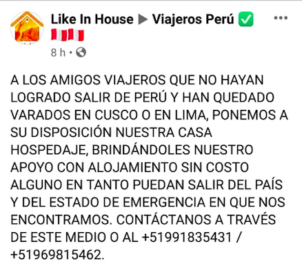 El comunicado dice lo siguiente: «A los amigos viajeros que no hayan logrado salir de Perú y han quedado varados en Cusco o en Lima. Ponemos a su disposición nuestra casa de hospedaje, brindándoles nuestro apoyo con alojamiento sin costo alguno en tanto puedan salir del país y del estado de emergencia en que nos encontramos. Contáctanos a través de este medio…»