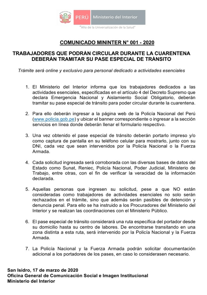 Dicha información fue brindada para el programa Buenos Días Perú, en donde Morán recordó a todos los ciudadanos acatar a las normas señaladas. No salir a la calle a las 8:00 p.m y las 5:00 a.m.