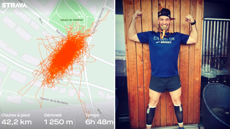 In confinement, Elisha Nochomovitz runs a marathon on his balcony in 6 hours and 48 minutes. Only problem ? «The course is ugly, no atmosphere», and his GPS has literally cracked 😂😭