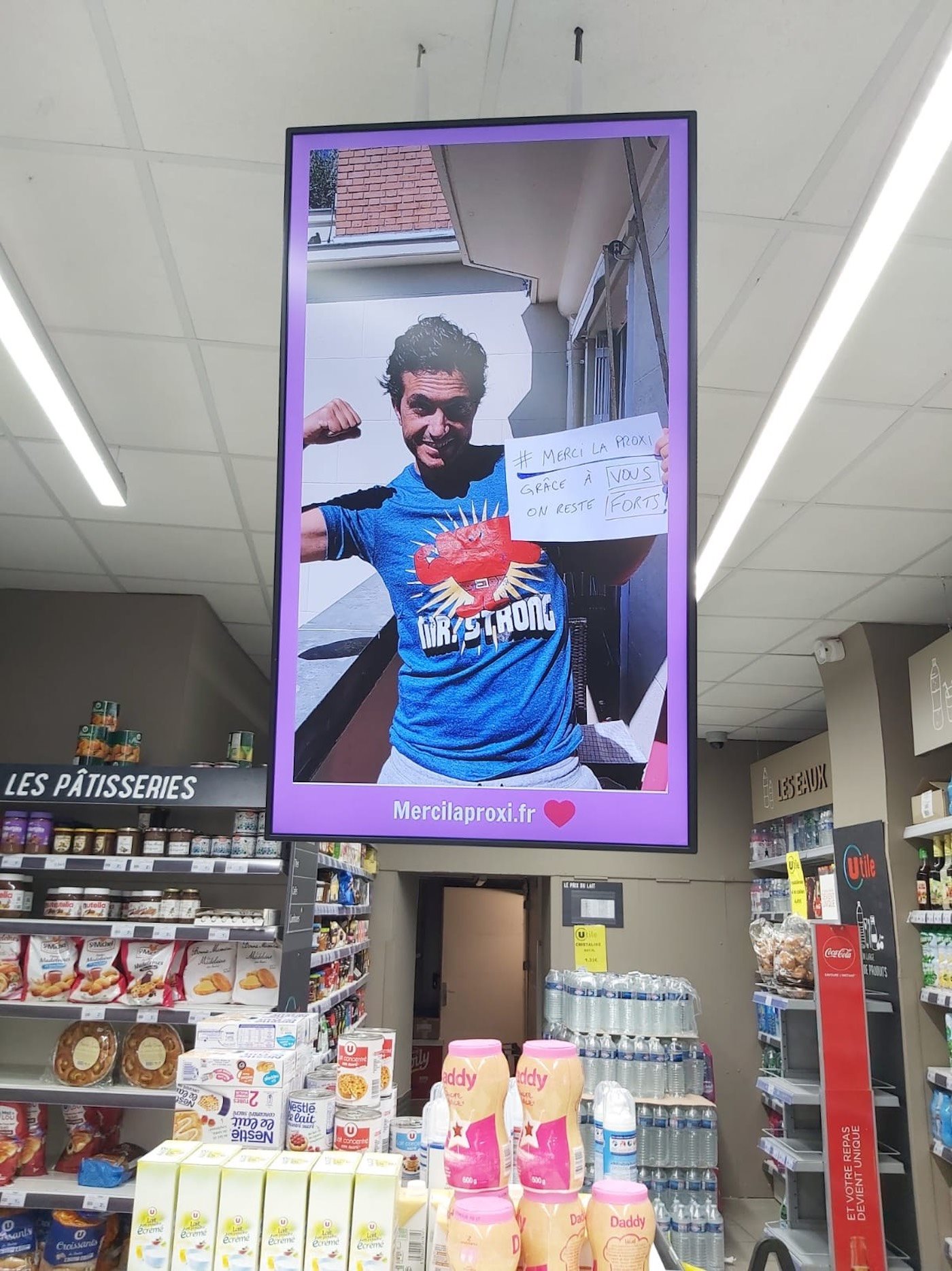 El objetivo de esta operación participativa es brindar su apoyo, a quienes abastecen nuestras tiendas, con la ayuda de una pequeña foto. Para participar es muy simple: simplemente se deben tomar una foto con un pequeño mensaje de solidaridad antes de enviarlo al sitio de MerciLaProxi. Por lo tanto, su foto se mostrará en las 500 pantallas ubicadas en las 300 tiendas asociadas de la empresa (todas ubicadas en Île-de-France).