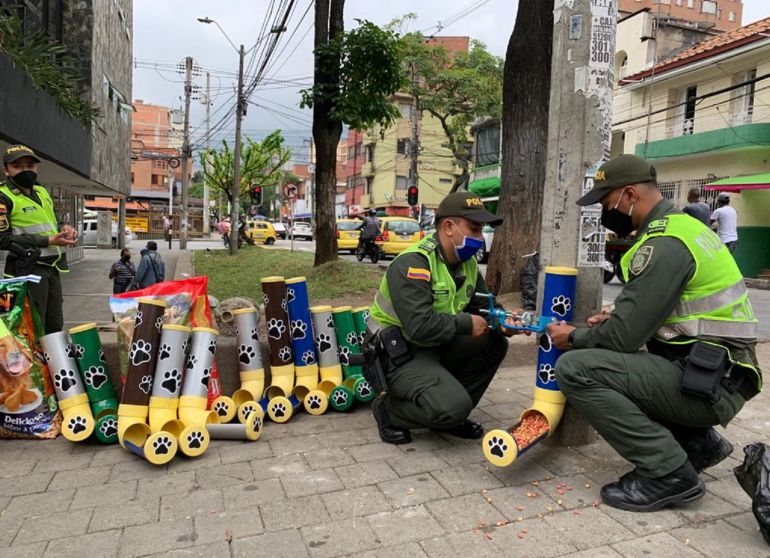 Solo fueron necesarios tubos de pvc, pintura y pegante para armar los dispensadores de comida artesanales para perros y gatos los cuales fueron instalados en las calles de Medellín.