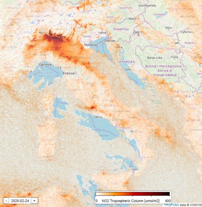 La Agencia Espacial Europea (ESA), junto con algunos investigadores independientes, las emisiones de dióxido de nitrógeno han disminuido significativamente en Italia después del bloqueo provocado por la propagación de COVID-19.