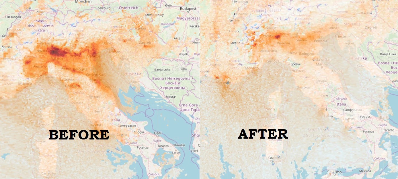 El satélite Copernicus Sentinel-5P notó una caída en las emisiones de NO2, lo que indica la disminución de la contaminación del aire, con el cambio más notable señalado en la parte norte del país, la región más afectada por el coronavirus .