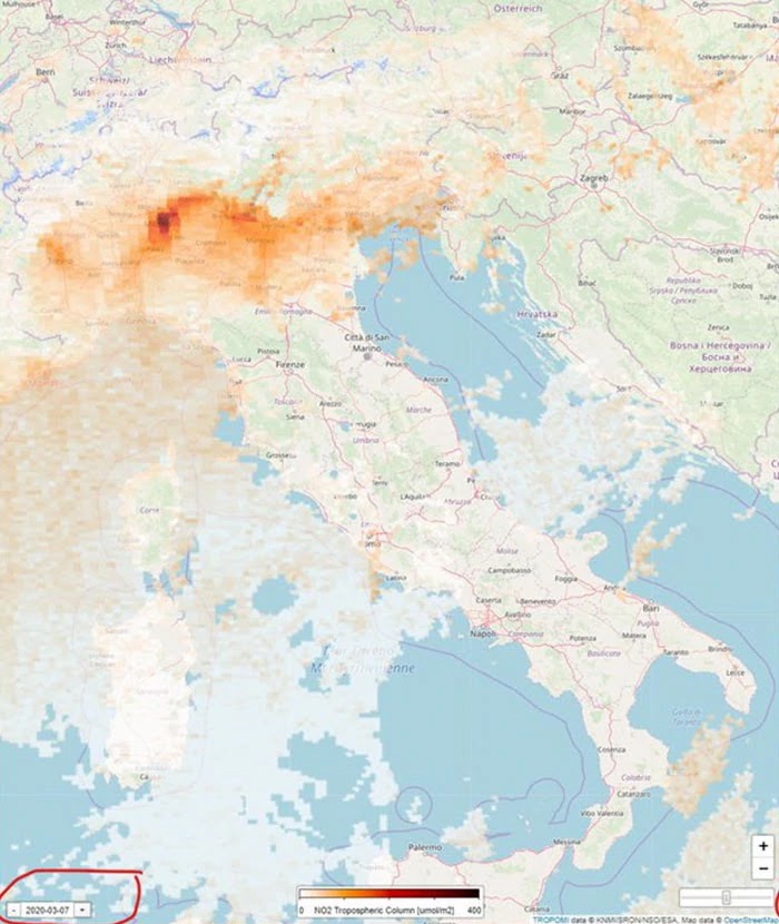 Los científicos e investigadores informan una caída significativa en los niveles de NO2 por encima de Italia.