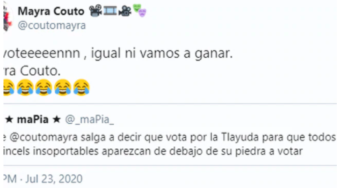 “No voteeeeennn , igual ni vamos a ganar”, escribió la actriz que se encuentra estudiando en Cuba, para luego agregar en otro tuit el motivo: “Son 120 millones mexicanos”, explicó Couto.