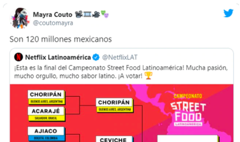 La actriz peruana Mayra Couto decidió hablar sobre la votación a favor del ceviche peruano, el plato emblema que estaba concursando en el Campeonato Street Food Latinoamerica de Netflix Latinoamérica.
