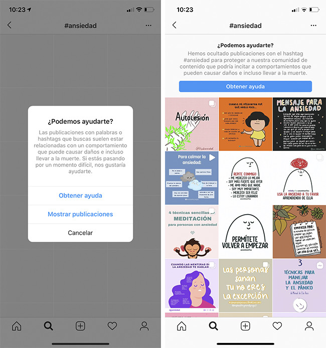 Lo hacen mediante los hashtags #depresión y #ansiedad, que alojan un mensaje de ayuda que nos llevará a un teléfono al que podemos llamar para solicitar ayuda con nuestro problema.
