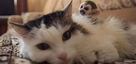 En los últimos días se hizo viral el video de una gata y un mono. Esto se debe a que, aparentemente, un pequeño mono, habría perdido a su madre, y, por tratar de sobrevivir, se aferró a la panza de lo que aparenta ser una gata, ya que, sin ningún problema, el felino, adoptó al pequeño animal y lo transporta con ella.